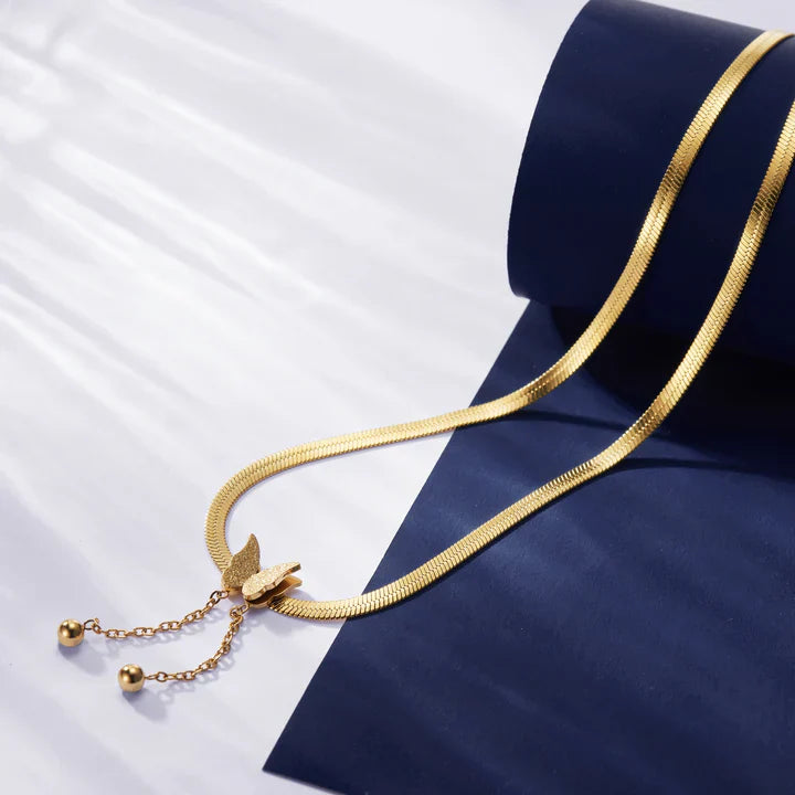 The Butterfly Necklace embodies the grace of transformation and the beauty of new beginnings. A delicate butterfly pendant rests close to the heart, finished in a warm gold-tone to catch the light with every movement.